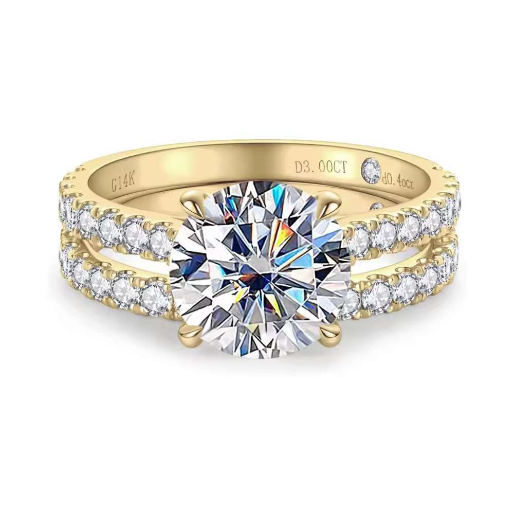Crafted with care, this 10K Gold ring combines sophistication with modern elegance, making it an ideal choice for engagements or special occasions. The dazzling Round Moissanite center stone not only offers exceptional sparkle but is also an ethical and affordable alternative to traditional diamonds. With a total weight (T.W.) ranging from 2.5 to 6 CT, this ring captures attention with its vibrant brilliance and stunning fire. The option for personalized engraving allows you to include a special message, making this beautiful ring a cherished keepsake. Designed in a bridal set style, it pairs perfectly with matching bands to create a cohesive and exquisite look. Celebrate your love story with this remarkable piece, destined to be cherished for a lifetime.