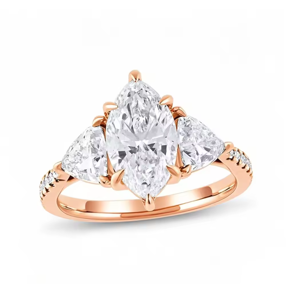 Elevate your love story with our stunning 10K Rose Gold engagement ring featuring a captivating Pear Cut Lab Created Diamond. This exquisite three-stone design, boasting a total weight of 3.33 CT, showcases a flawless D-color diamond with VVS1-VS1 clarity, making it the perfect symbol of your commitment to timeless elegance and romance.