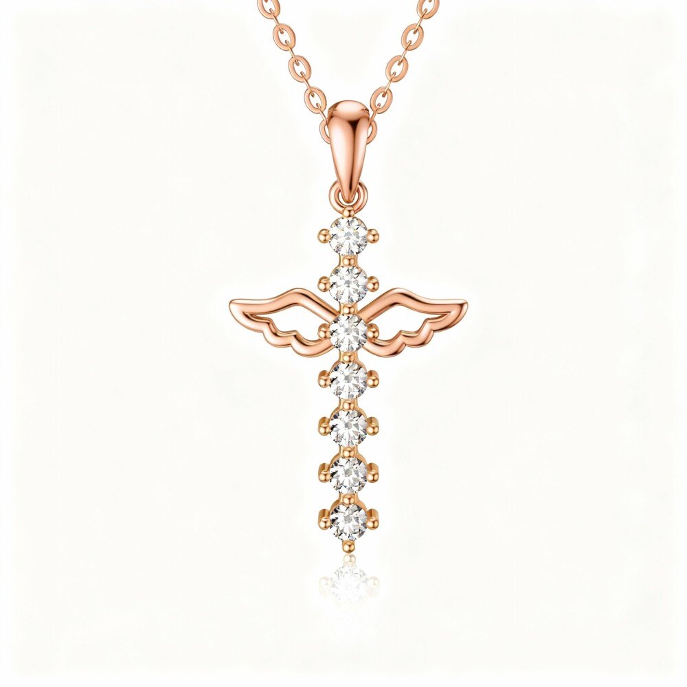 Experience the perfect blend of elegance and spirituality with our 10K Rose Gold Angel Wing and Cross Pendant Necklace, designed to captivate every onlooker.