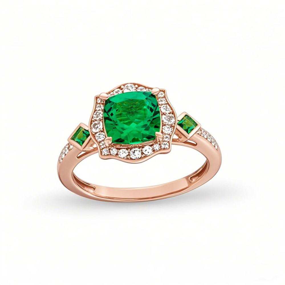 Discover our stunning 10K rose gold engagement ring, featuring an exquisite halo design with a large lab-created emerald at its center, enhanced by sparkling lab-created diamonds. Crafted with exceptional polish, cut, and symmetry, this breathtaking ring showcases a diamond color of D and clarity ranging from VVS to VS, making it the perfect symbol of everlasting love for the modern woman, with side stones that total 0.15 CT, ensuring brilliance and elegance in every facet.