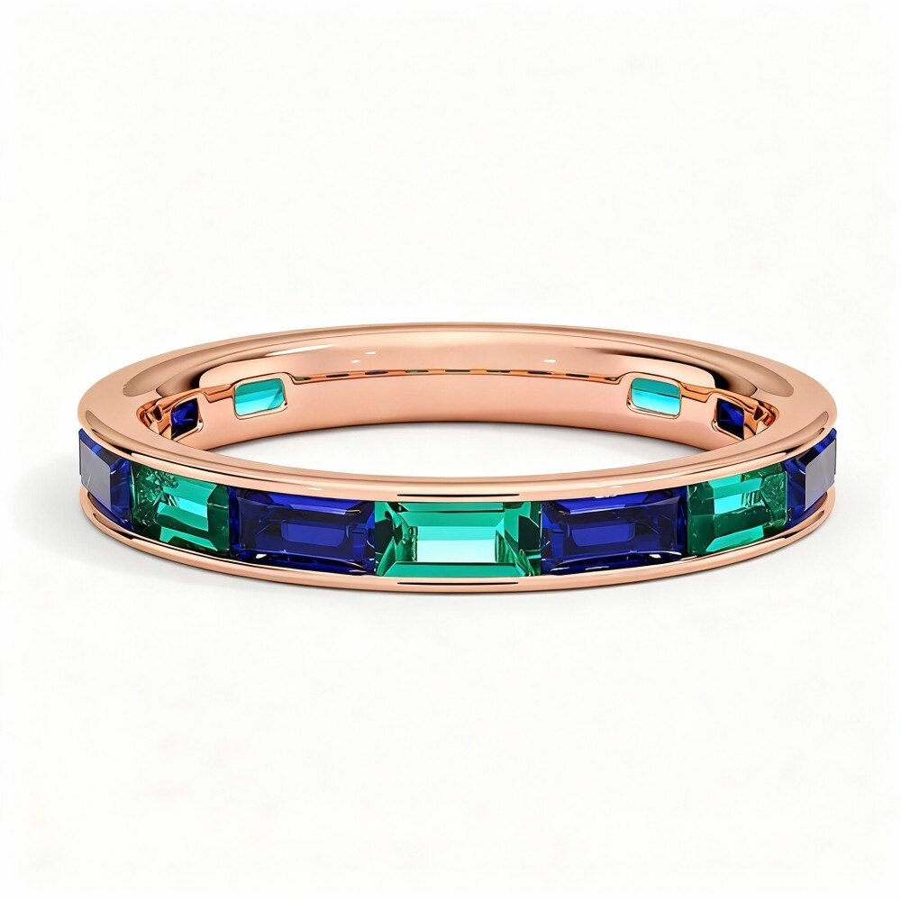 Introducing our stunning channel-set jewelry piece, featuring a captivating combination of lab-grown emeralds and aquamarine that exude elegance and vibrancy. This exquisite design showcases seven baguette-cut lab-grown emeralds, each measuring 4 x 2 mm and displaying a rich medium green color with eye-clean clarity, ensuring they shine brilliantly in any light. Complementing the emeralds are six baguette-cut lab-grown aquamarine, also sized at 4 x 2 mm, radiating an intense blue hue with equally captivating eye-clean clarity. The channel setting securely holds each gemstone in place, allowing for a seamless flow of color and brilliance. Perfect for those who appreciate sustainable luxury, this piece offers a timeless and sophisticated addition to any jewelry collection, celebrating the harmonious blend of nature-inspired colors.