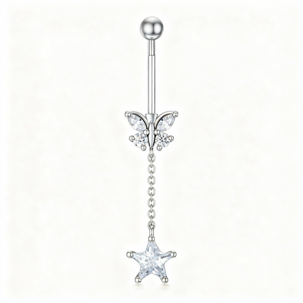 Embrace elegance with our 14K White Gold Belly Button Ring, featuring dazzling Cubic Zirconia and enchanting designs such as butterflies and stars in lustrous White Gold and white, perfect for women who love to shine.