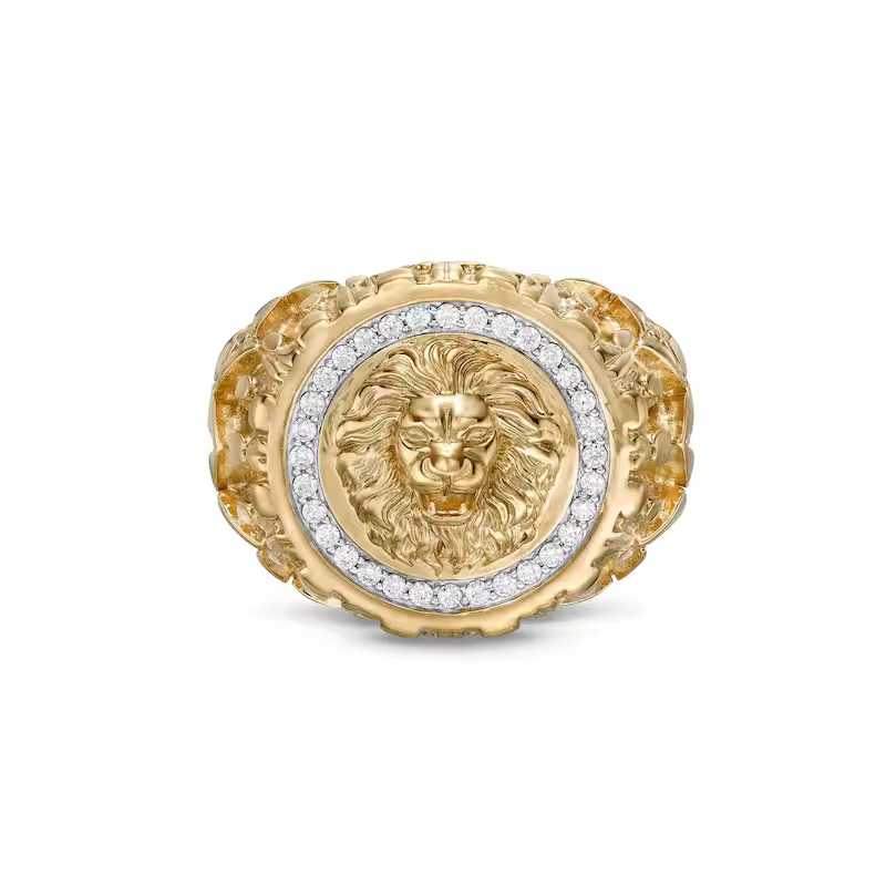 This stunning 18K Gold Lion Ring is more than just jewelry; it's a bold statement piece that embodies the spirit of the modern man. Designed with a unique round shape and adorned with intricate diamond detailing, this ring captures the majestic essence of the lion, symbolizing strength and courage. Whether you're dressing up for a formal event or going for a casual outing, this piece serves as a perfect accessory that seamlessly complements any outfit. The durable 18K gold construction ensures that it withstands daily wear while retaining its brilliant shine. Embrace your wild side and express your individuality through this captivating piece of artistry that expertly combines sophistication and craftsmanship. The striking round top features a meticulously crafted lion's head design, complete with detailed facial features and a flowing mane. With a total diamond weight of 1/4 carat, the sparkling diamonds are set within a unique nugget-textured shank, adding depth and interest to this luxurious ring. Make a powerful statement and elevate your style with this unforgettable piece of jewelry.