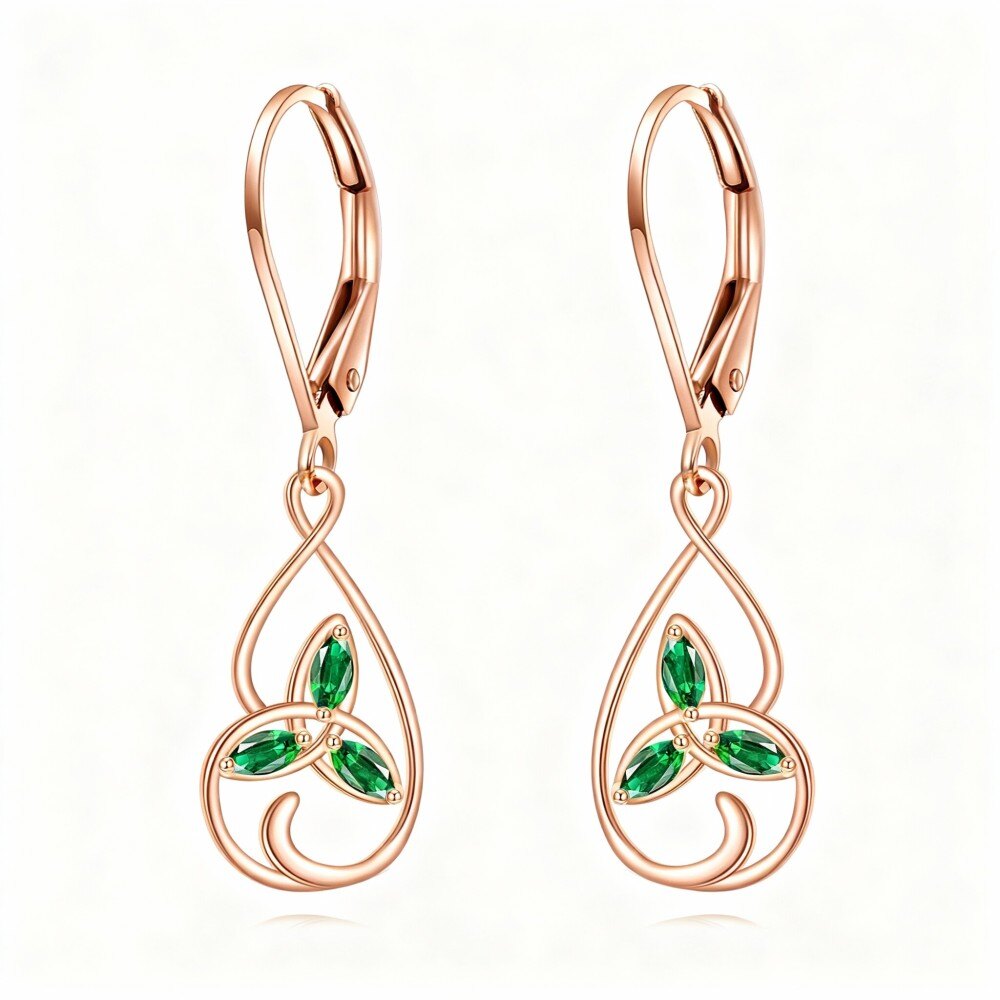 Elevate your style with our exquisite 18K Rose Gold Lever-back Earrings featuring a stunning Celtic Knot design adorned with vibrant green Cubic Zirconia stones.