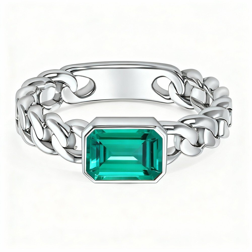 Introducing our stunning lab-grown emerald, a remarkable gemstone that embodies elegance and sustainability. This exquisite emerald is cut in a beautiful emerald shape, measuring 7 x 5 mm. It showcases a rich medium green color, reflecting the lush beauty of nature. With eye-clean clarity, this stone sparkles brilliantly without any visible inclusions, ensuring a vibrant and captivating appearance. Set in a secure bezel setting, the emerald is beautifully framed, allowing its lush color to take center stage while providing protection and durability. This stunning gemstone is perfect for creating a statement piece, whether as a ring, pendant, or an addition to a bespoke jewelry design. Celebrate your unique style and commitment to sustainability with this breathtaking lab-grown emerald, a timeless treasure for any jewelry collection.