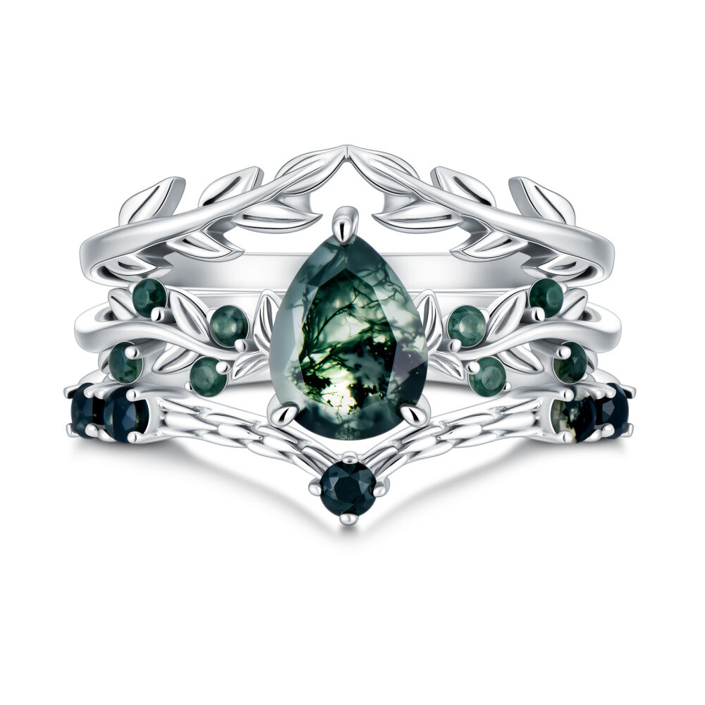 This exquisite bridal set features a captivating 2 CT pear-cut Moss Agate center stone, celebrated for its unique patterns and tranquil hues. Crafted with the utmost precision from high-quality 18K White Gold, this jewelry set radiates sophistication and durability, making it an ideal choice for engagements or cherished moments. The stunning design highlights the beauty of the central stone while ensuring a comfortable fit for daily wear. Not only does this set make a bold statement, but it also serves as a lifelong treasure that symbolizes love and devotion. Perfect for brides-to-be or anyone looking to leave a lasting impression, this bridal set captures the essence of elegance and timeless beauty.