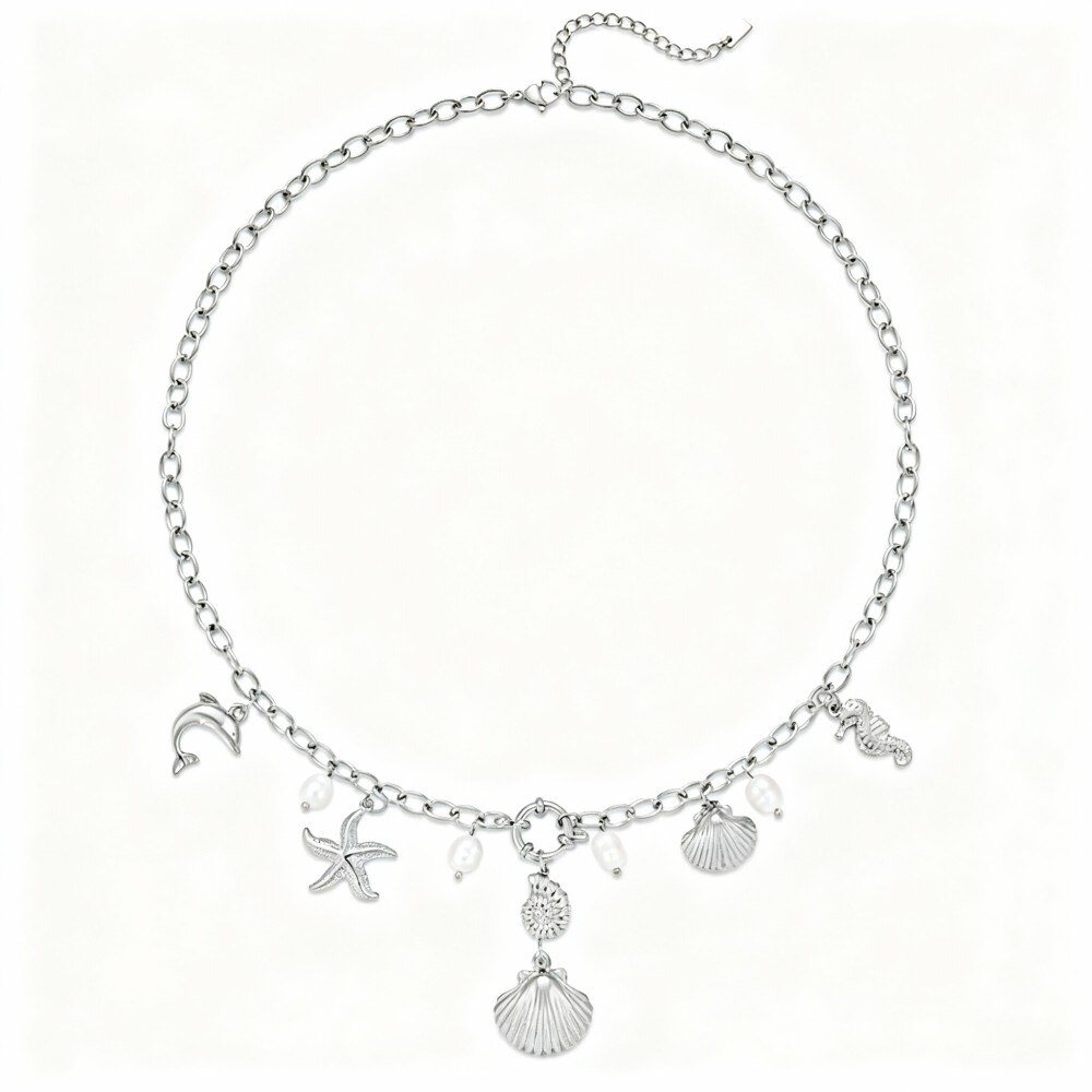 Crafted from premium 10K White Gold, this stunning necklace showcases a luminous pearl at its center, symbolizing grace and refinement. The intricately designed marine charms—dolphin, seahorse, starfish, and shell—add a playful yet sophisticated touch to any outfit. Versatile enough for both everyday wear and special occasions, it can be layered or worn solo for a bold statement. An ideal gift for those who adore the sea or a timeless addition to your jewelry collection, this piece reflects exceptional artistry and timeless beauty. Each detail is meticulously crafted to ensure durability and allure, making it a cherished accessory for years to come.